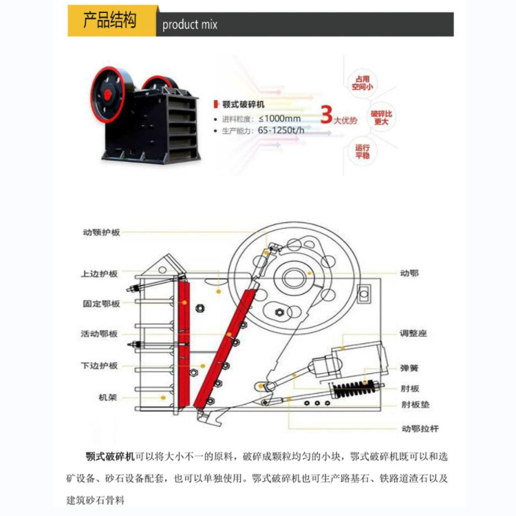 顎式破碎機是出現較早的破碎設備,因其構造簡單、堅固、工作可靠、維護和檢修容易以及生產和建設費用比較少,因此,直到現在仍然廣泛地在冶金、化工、建材、電力、交通等工業部門,用于破碎抗壓強度在147~245MPa的各種礦石和巖石的粗、中、細碎。