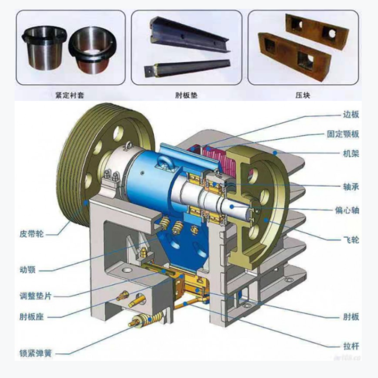 顎式破碎機(jī)配件也可稱為顎式破碎機(jī)易損件,是顎破機(jī)重要的組成部分;在一定的周期范圍內(nèi)需要更換。可分為顎板、肘板、邊護(hù)板、齒板、三角帶等。