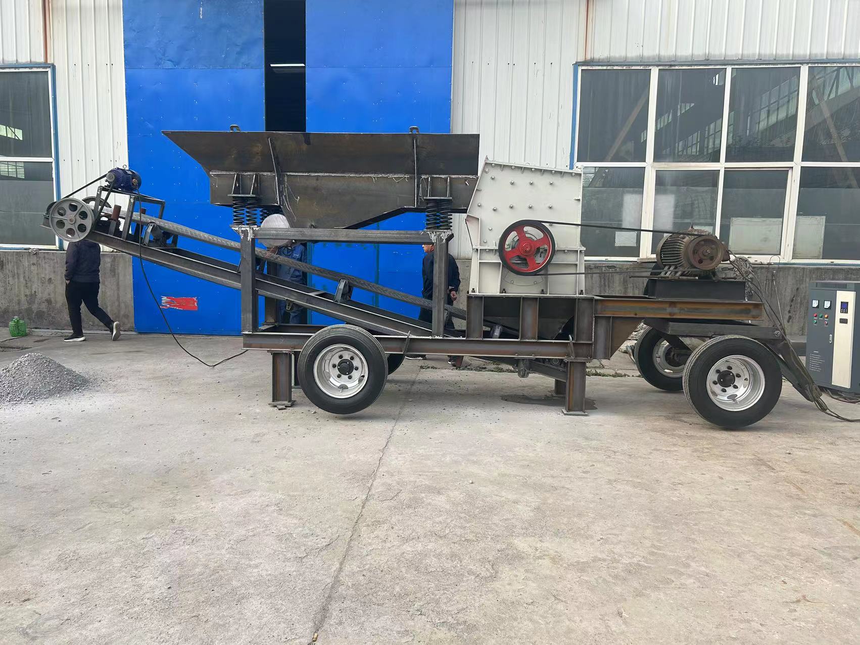 移動式破碎機的行走方式是通過車頭牽引至生產場地,無需打樁,無需處理場地,可直接進入生產的,配備的主要石頭破碎設備可以是不同類型,如鄂式破碎機、